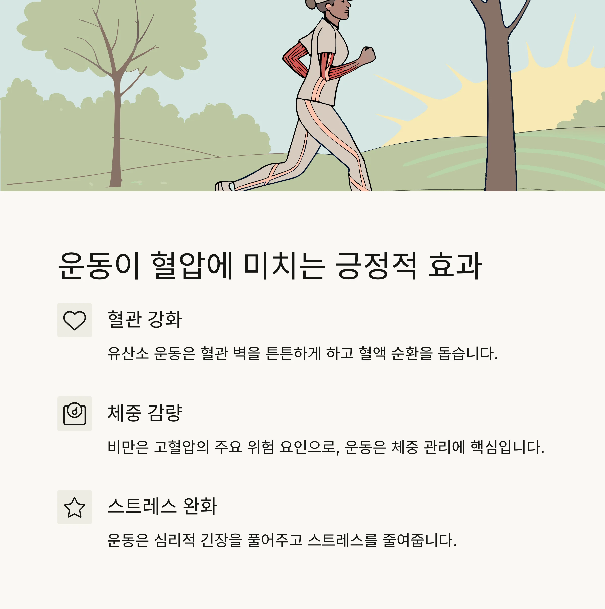 - 체중 감량: 비만은 고혈압의 주요 위험 요인으로, 운동은 체중 관리에 핵심입니다.
